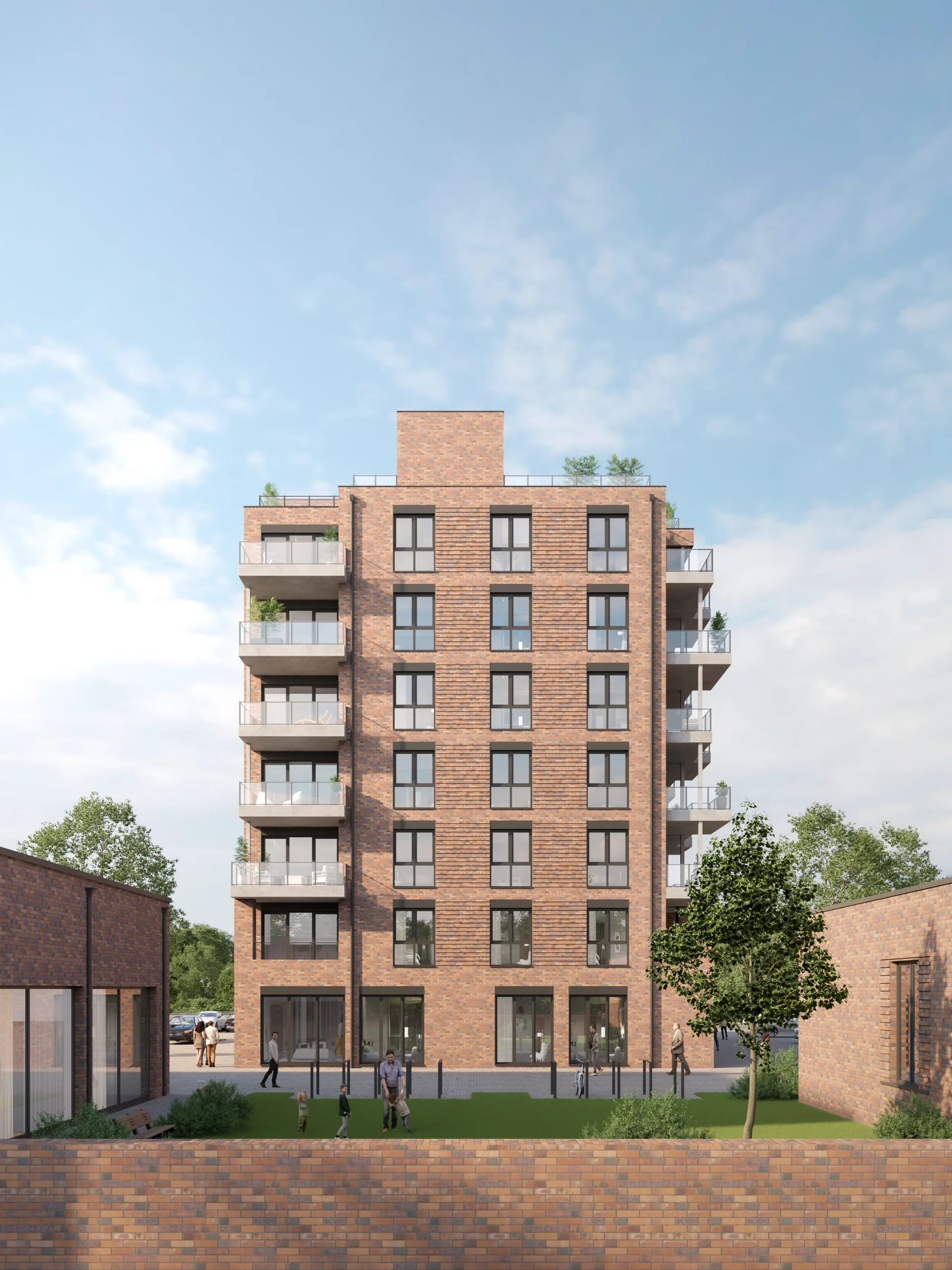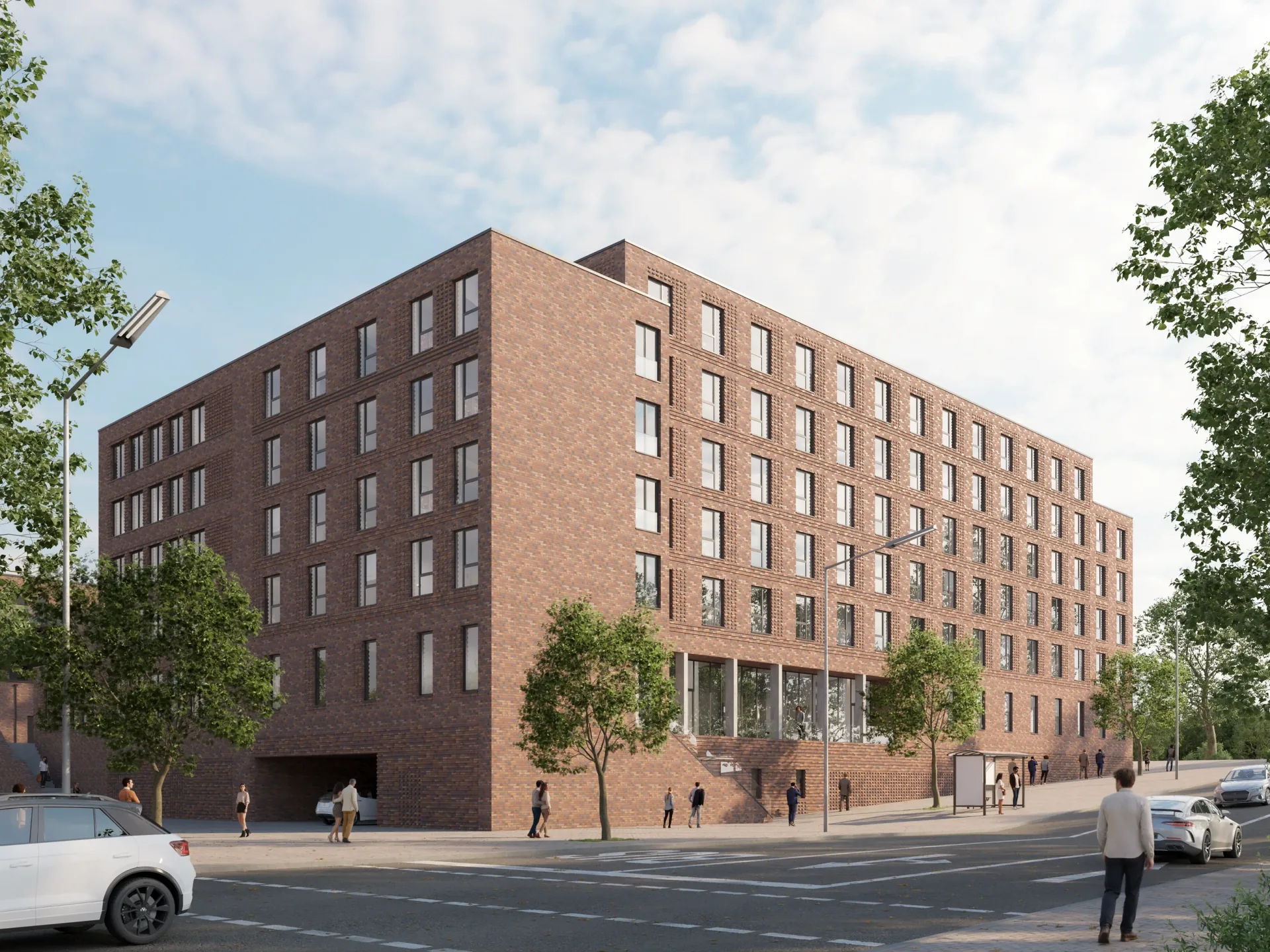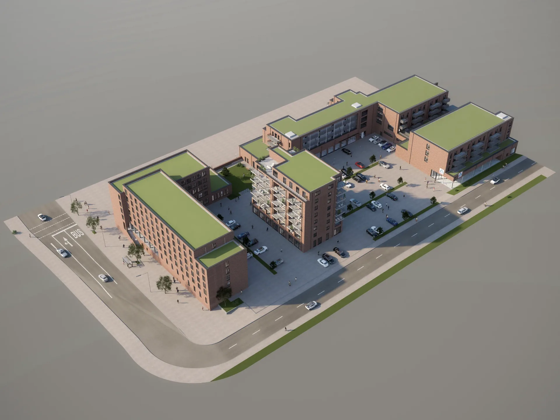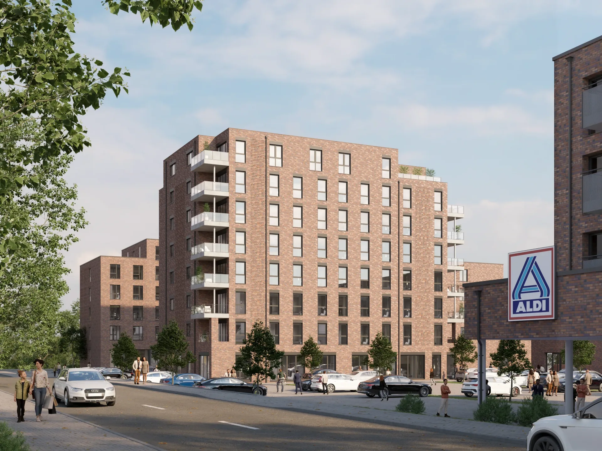 Gemischtes Quartier mit Wohnungen und Gewerbeflächen – Außenvisualisierungen zur Vermarktung.